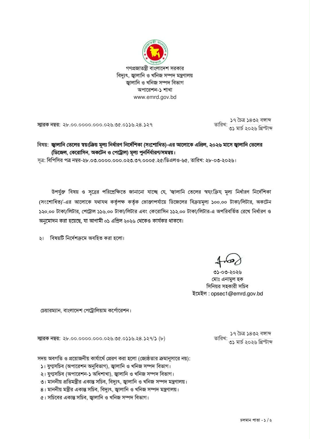 The price of diesel remains at Tk100 per litre, octane at Tk120 per litre, petrol at Tk116 per litre, and kerosene at Tk112 per litre, per a circular, effective from 1 April.