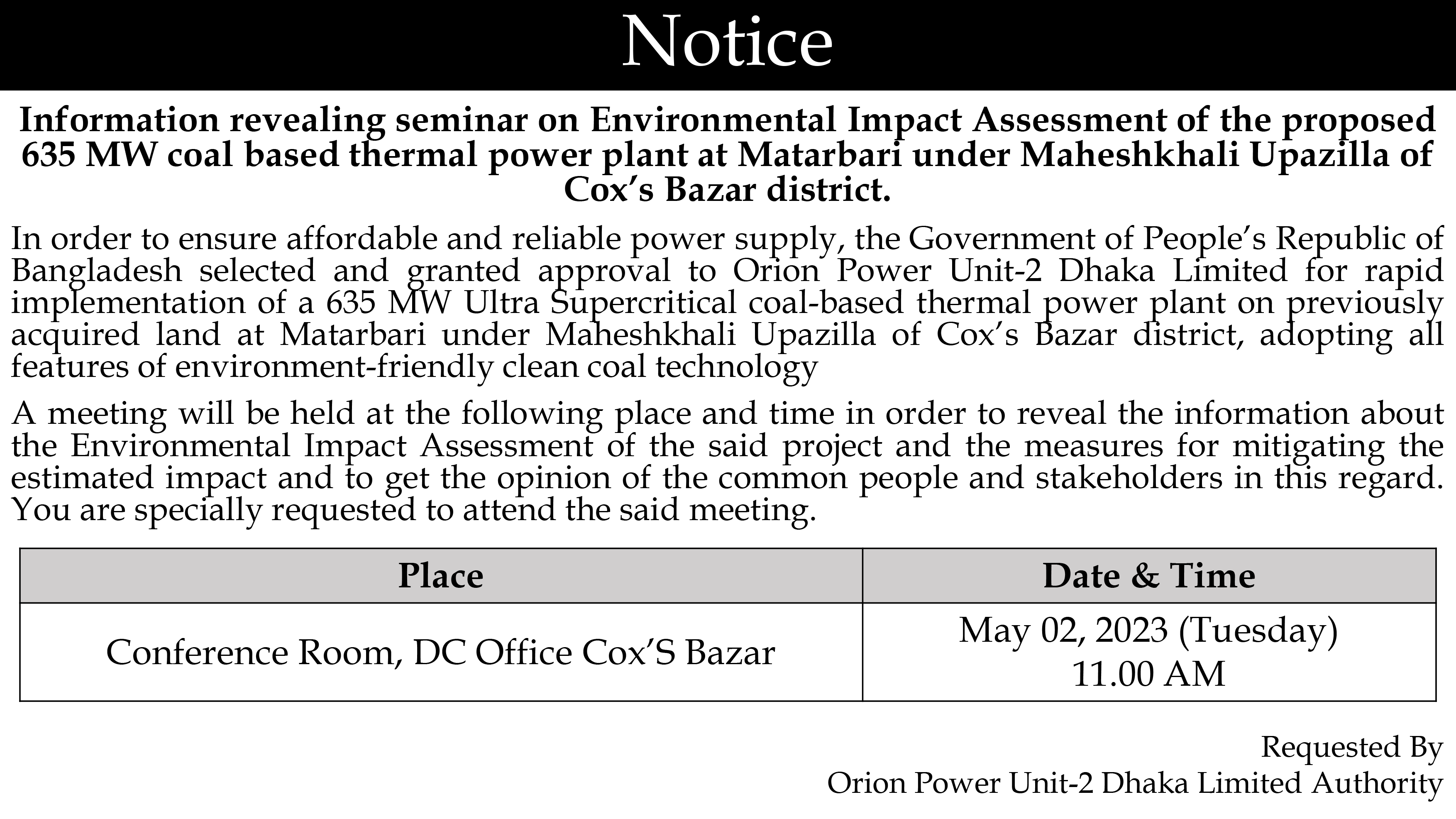 Seminar to be held on Environmental Impact Assessment of proposed 635MW thermal power plant in Matarbari