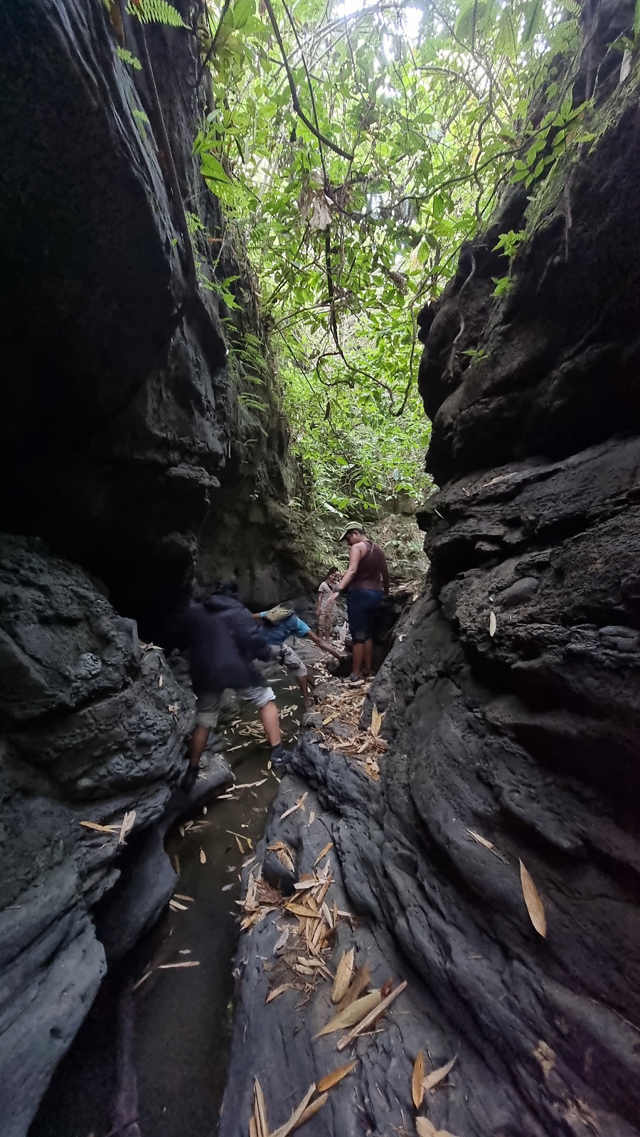 Soon the terrain changed. Solid boulders cropped up everywhere in the stream, some of them slippery and with sharp edges. The loose earth turned into stones. We were soon walking through a gully in the rock. It was narrow and slippery so that we could not stand straight any more. We made our way almost perpendicular to the gully, with our hands and legs pushing on the two opposite walls made by the ancient rocks.