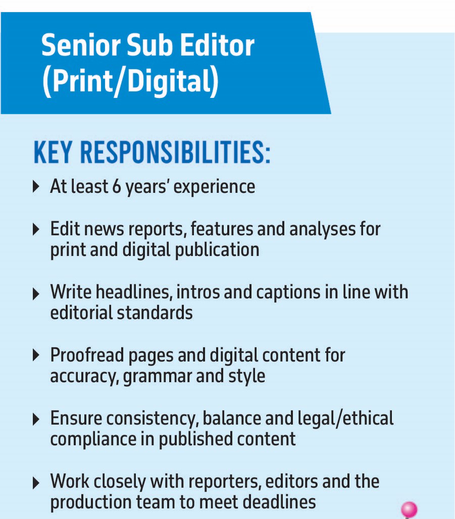 Position: Senior Sub Editor (Print/Digital)