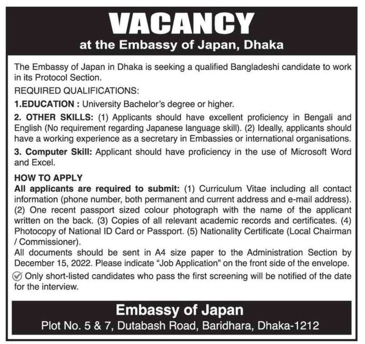 The Embassy of Japan in Dhaka is seeking a qualified Bangladeshi candidate to work in its Protocol Section.