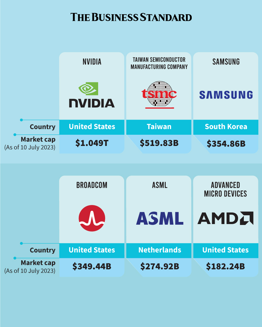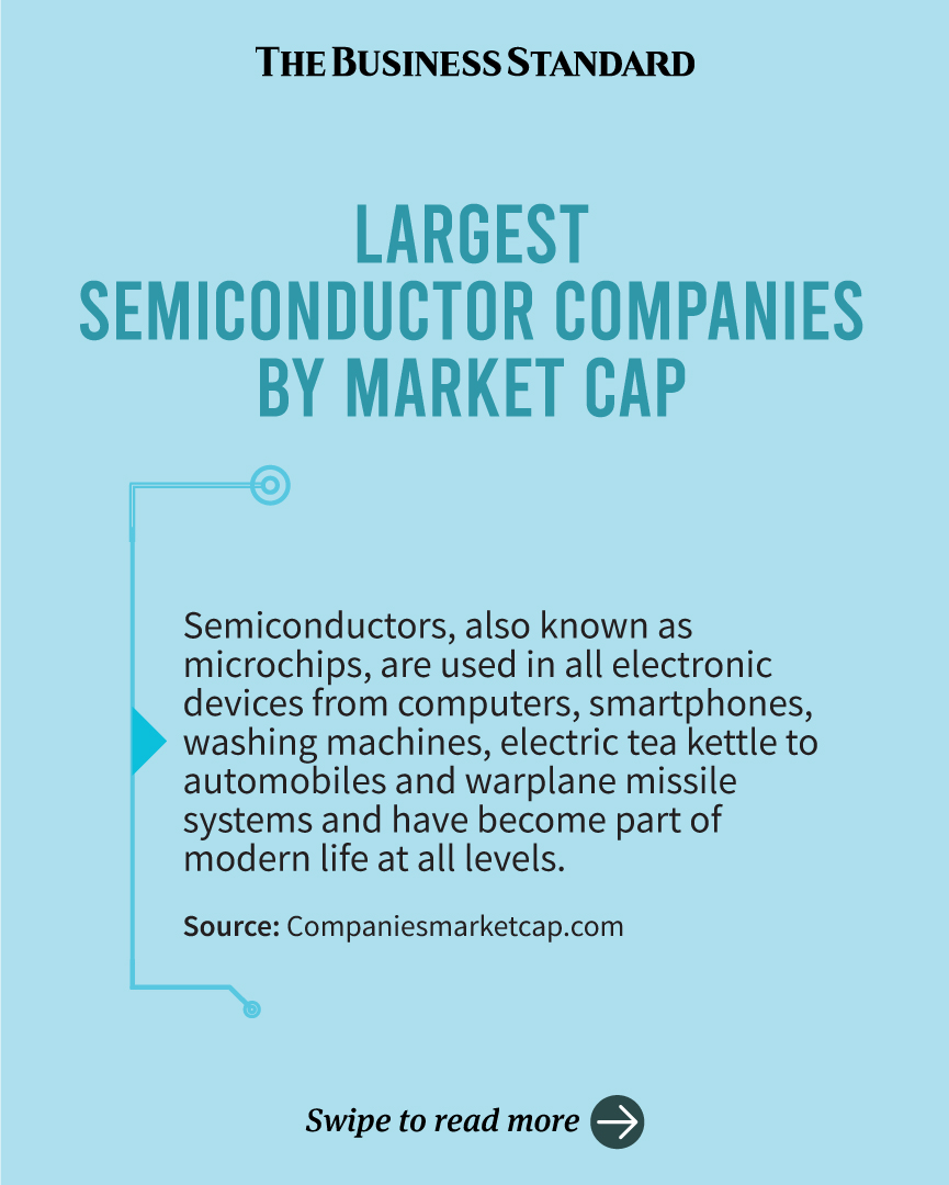 Largest semiconductor companies by market cap TBS Report 11 July, 2023, 12:15 pm Last modified: 11 July, 2023, 12:16 pm Download/Print Download/Print Infographic: TBS Keep updated, follow The Business Standard's Google news channel Semiconductor / Company / production