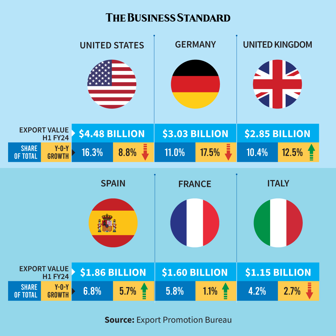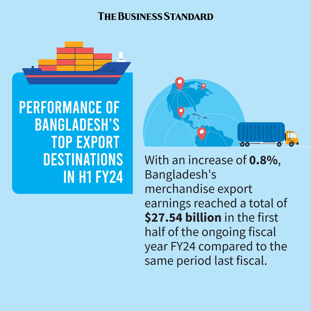 Performance of Bangladesh’s top export destinations in H1 FY24 TBS Report 25 January, 2024, 01:40 pm Last modified: 25 January, 2024, 01:47 pm Download/Print Download/Print Keep updated, follow The Business Standard's Google news channel export destination / merchandise / By the numbers