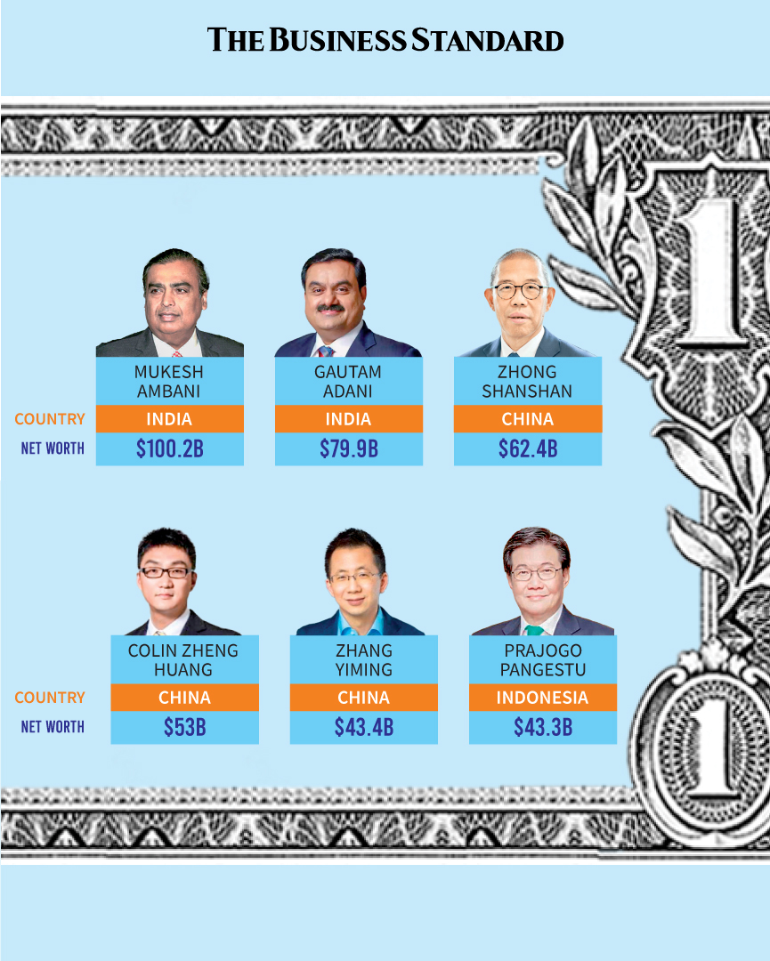 Richest People in Asia TBS Report 20 January, 2024, 03:25 pm Last modified: 20 January, 2024, 03:37 pm Download/Print Download/Print Keep updated, follow The Business Standard's Google news channel wealthiest man / Mukesh Ambani / Reliance Industries