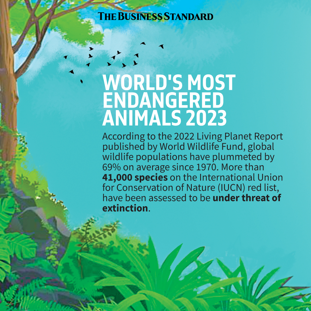 World's Most Endangered Animals 2023 TBS Report 24 January, 2024, 02:35 pm Last modified: 24 January, 2024, 02:42 pm Download/Print Download/Print Keep updated, follow The Business Standard's Google news channel Planet / Wildlife / Nature / Endangered animals / By the numbers
