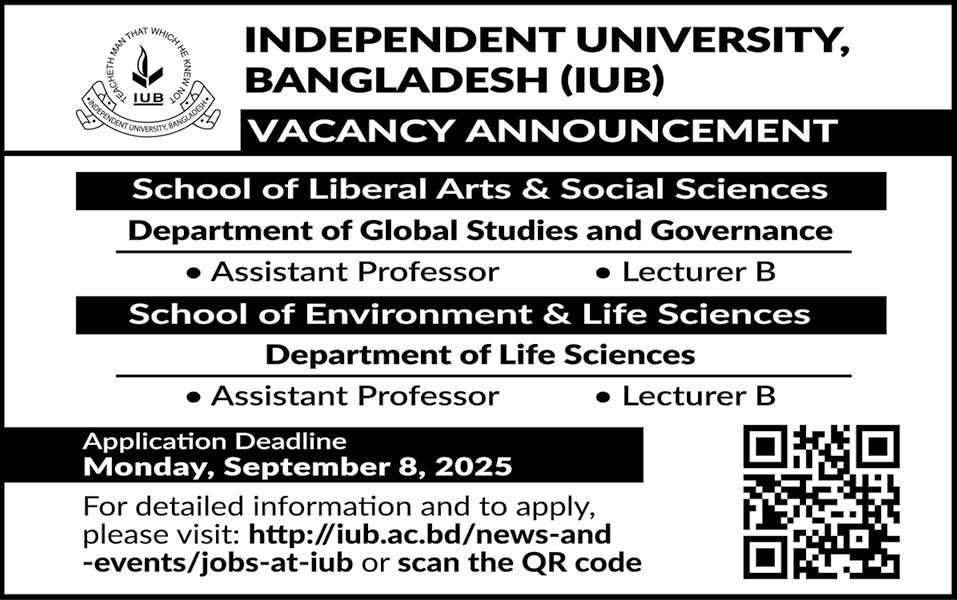 Assistant Professor | Independent University, Bangladesh (IUB) Job TypeFull Time Job SectorEducation/Training Job LocationDhaka Deadline08 September, 2025 Download/Print