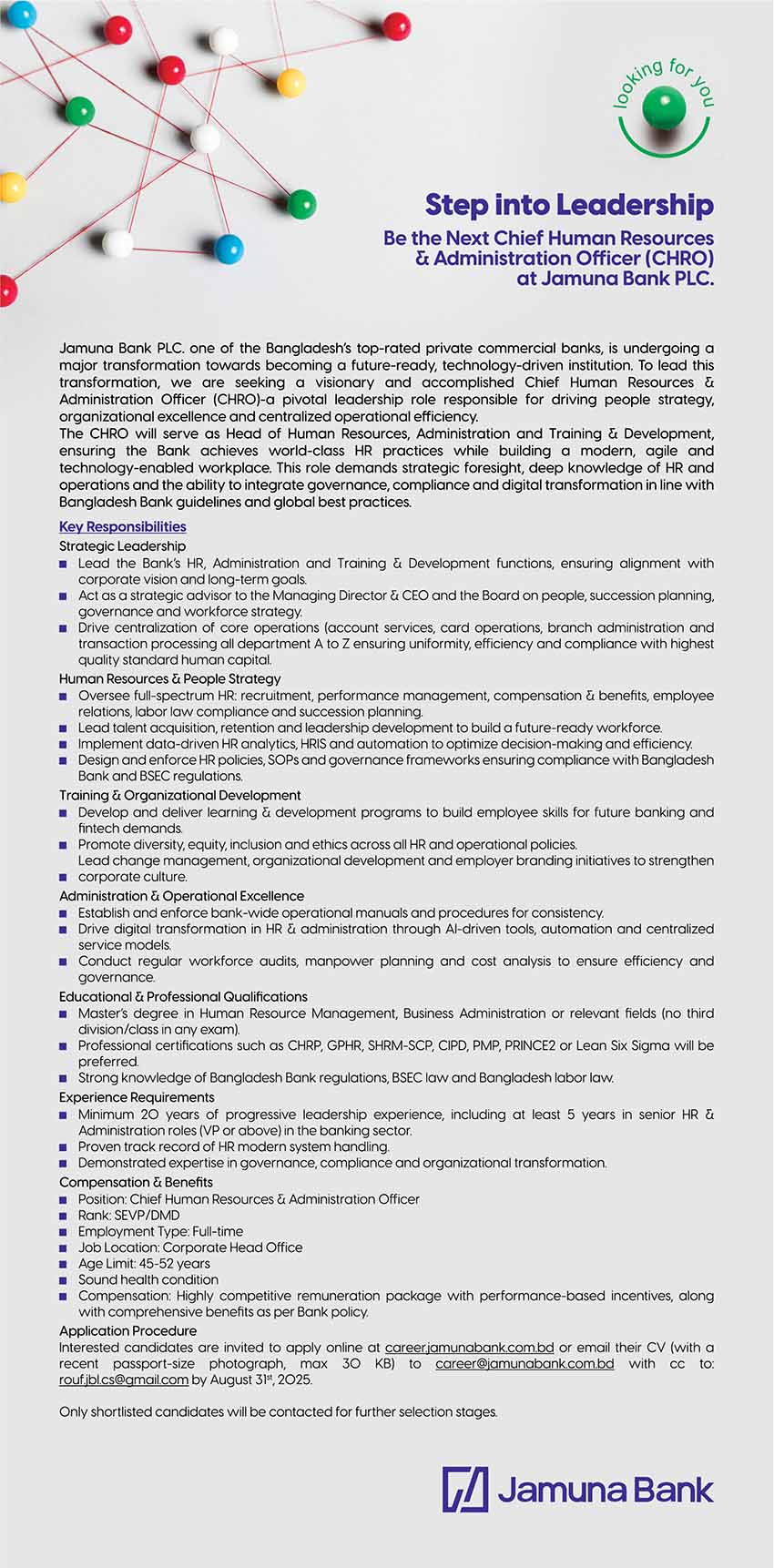 Chief Human Resources and Administration Officer (CHRO) | Jamuna Bank Job TypeFull Time Job SectorBank/ Non-Bank Financial Institution Job LocationDhaka Deadline31 August, 2025 Download/Print