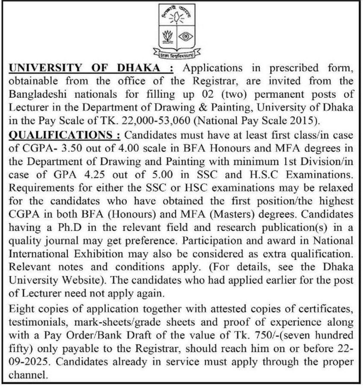Lecturer | University of Dhaka Job TypeFull Time Job SectorEducation/Training Job LocationDhaka Deadline22 September, 2025 Download/Print