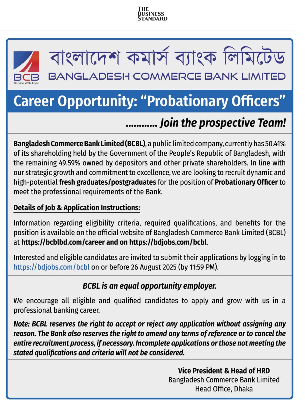 Probationary Officer | Bangladesh Commerce Bank Job TypeFull Time Job SectorBank/ Non-Bank Financial Institution Job LocationNot Specified Deadline26 August, 2025 Download/Print