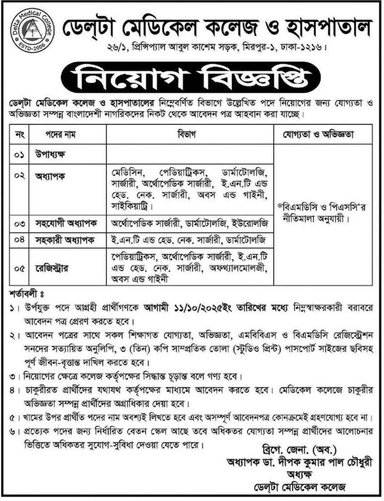 Professor | Delta Medical College & Hospital Job TypeFull Time Job SectorMedical/Pharma Job LocationDhaka Deadline11 October, 2025 Download/Print