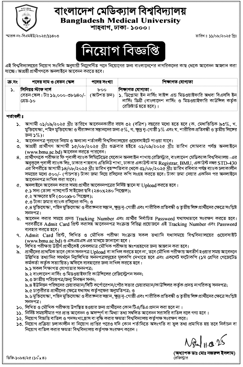 Senior Staff Nurse | Bangladesh Medical University Job TypeFull Time Job SectorMedical/Pharma Job LocationDhaka Deadline01 September, 2025 Download/Print