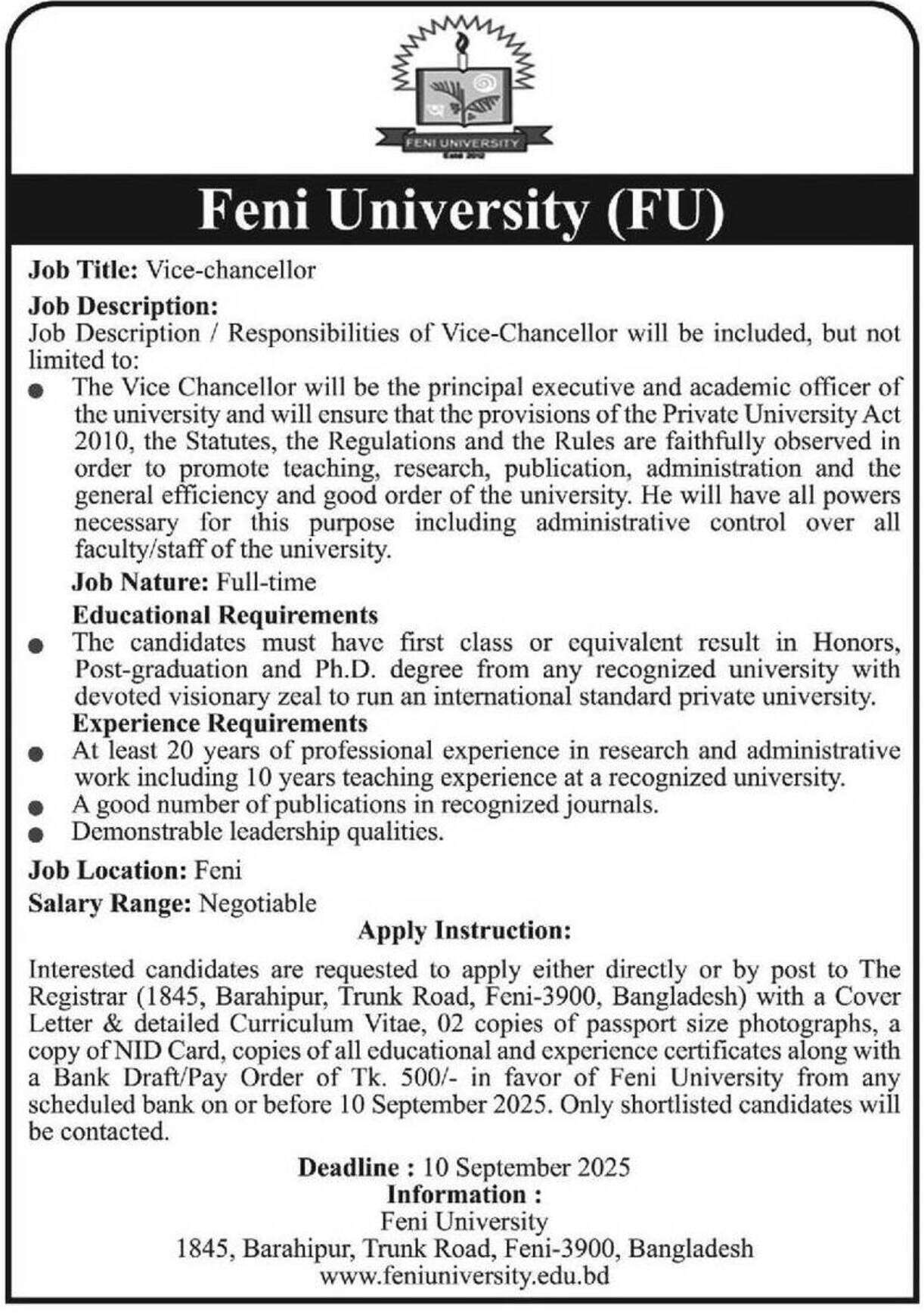 Vice-chancellor | Feni University Job TypeFull Time Job SectorEducation/Training Deadline10 September, 2025 Download/Print