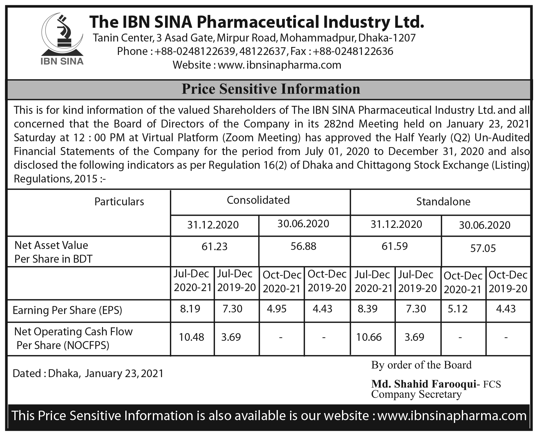 Ibn Sina Pharmaceuticals: Price Sensitive Information 24 January, 2021, 11:30 am Last modified: 24 January, 2021, 11:35 am Download/Print Ibn Sina