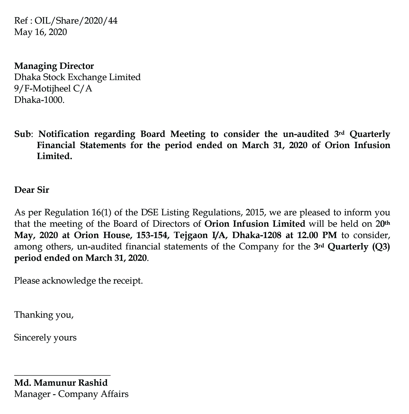 Orion Infusion: Un-Audited Third Quarterly (Q3) Financial Statements - DSE