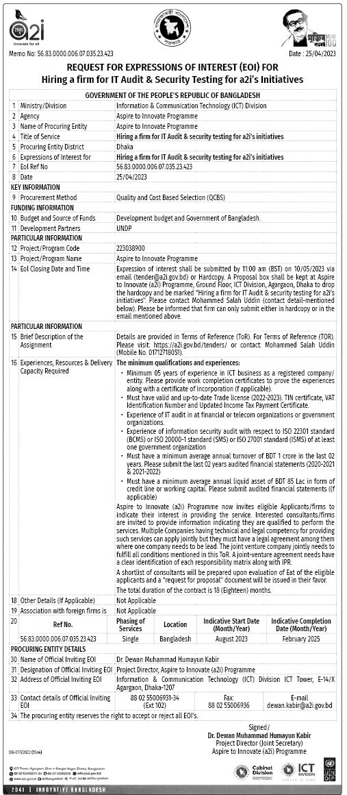 A2i requests for Expressions of Interest (EOI) for hiring firm for IT Audit 25 April, 2023, 09:30 pm Last modified: 25 April, 2023, 09:34 pm Download/Print Keep updated, follow The Business Standard's Google news channel a2i