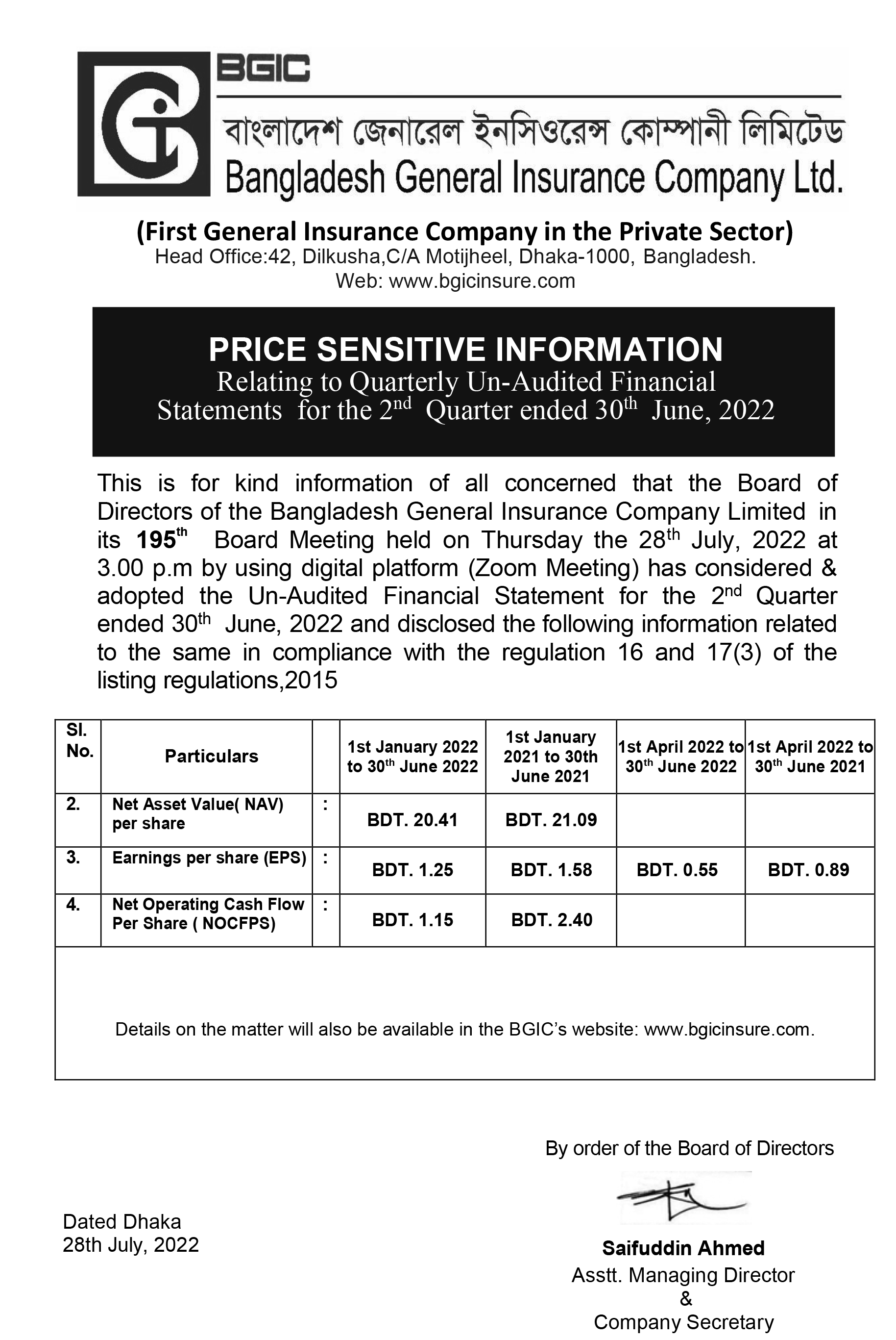 Bangladesh General Insurance Company: Price sensitive information 28 July, 2022, 05:55 pm Last modified: 28 July, 2022, 05:54 pm Download/Print PSI