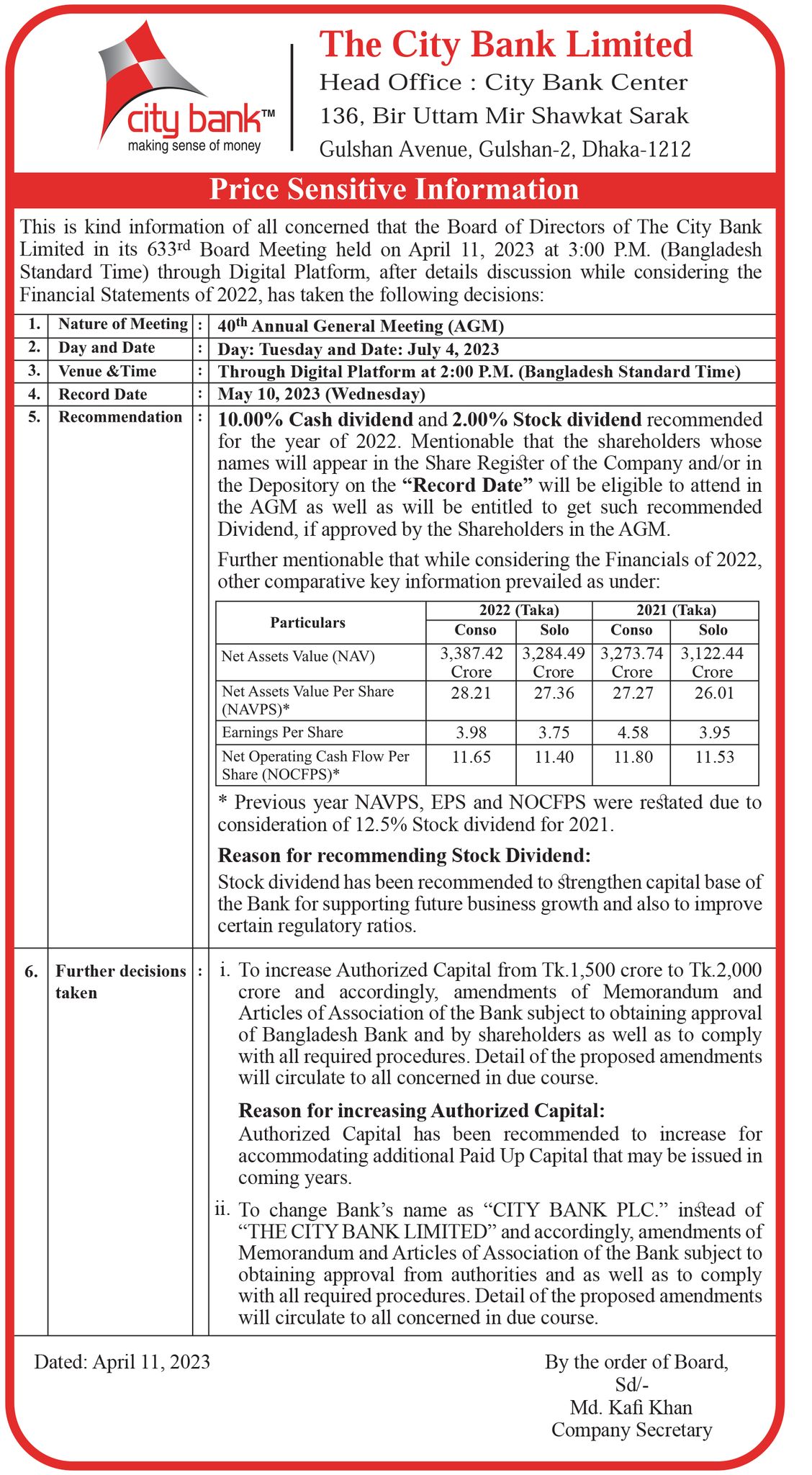 City Bank annual general meeting 11 April, 2023, 08:30 pm Last modified: 11 April, 2023, 08:43 pm Download/Print Keep updated, follow The Business Standard's Google news channel City Bank