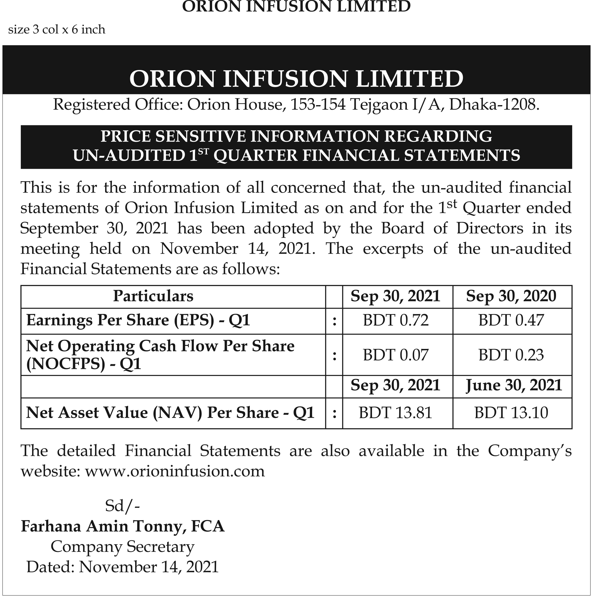 - Orion Infusion: Un-Audited Half Yearly (Q2) Financial Statements