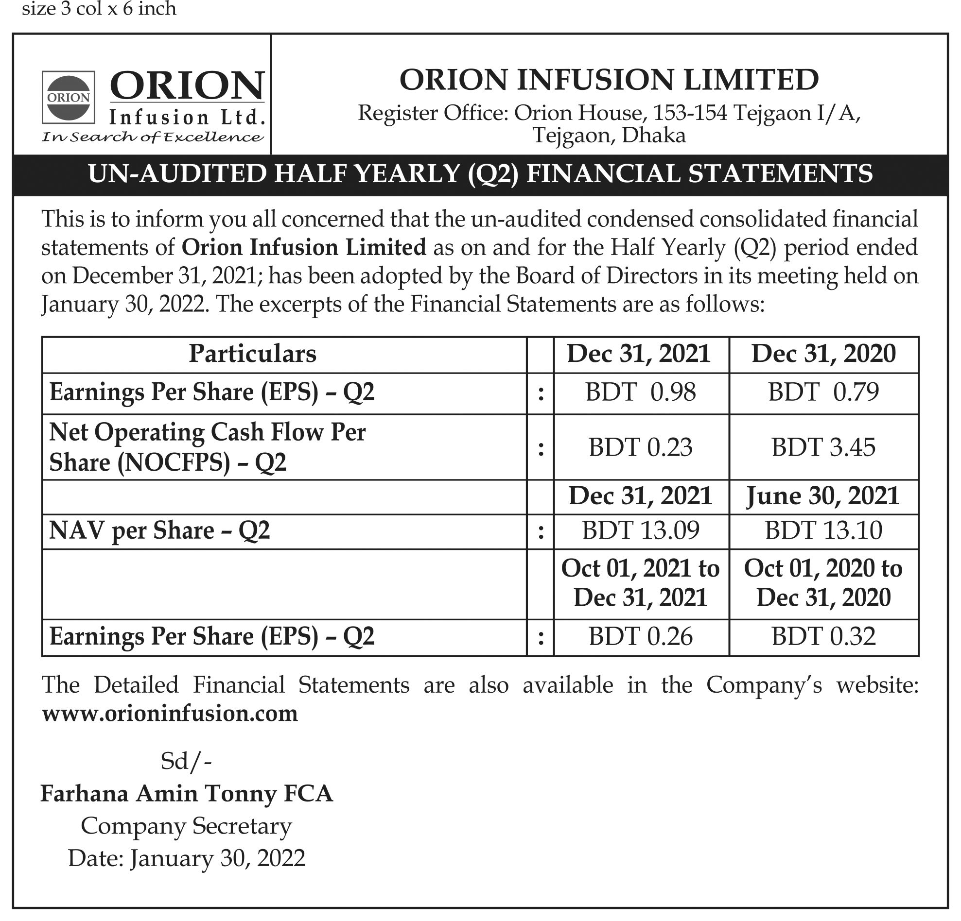 - Orion Infusion: Un-Audited Half Yearly (Q2) Financial Statements