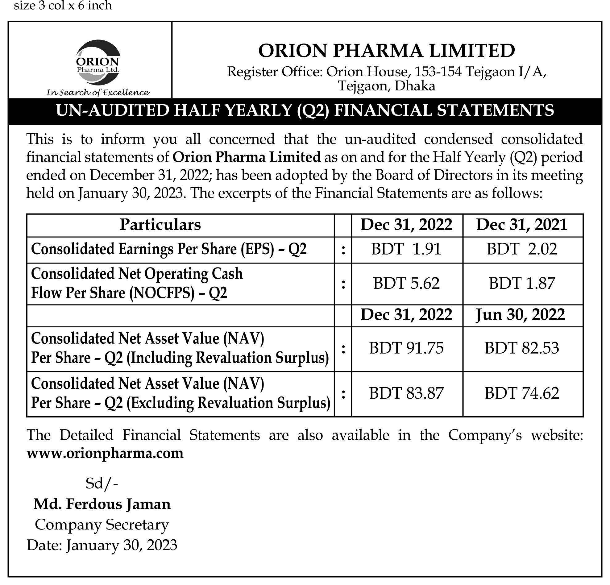 Orion Pharma: Un-Audited Half Yearly (Q2) Financial Statements