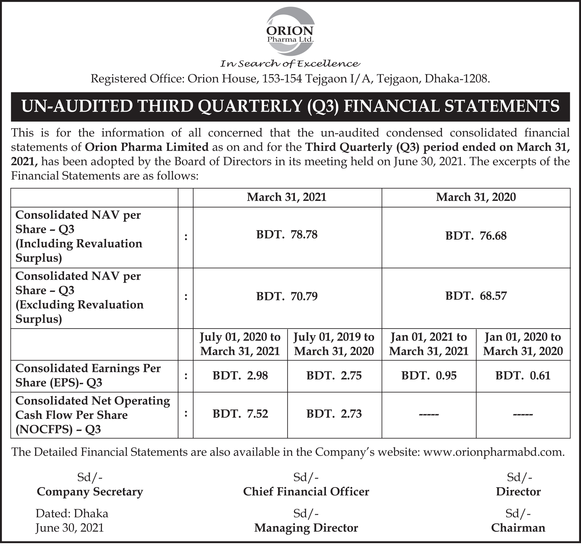 Orion Pharma: Un-audited Third Quarterly (Q3) Financial Statements