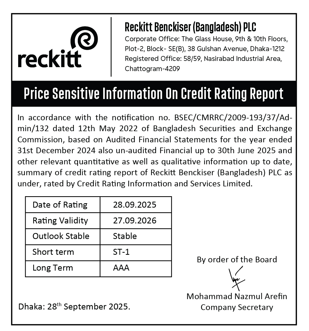 Price Sensitive Information on Credit Rating Report | Reckitt Benckiser (Bangladesh) PLC 28 September, 2025, 11:20 pm Last modified: 28 September, 2025, 11:22 pm Download/Print Keep updated, follow The Business Standard's Google news channel Reckitt Benckiser Bangladesh