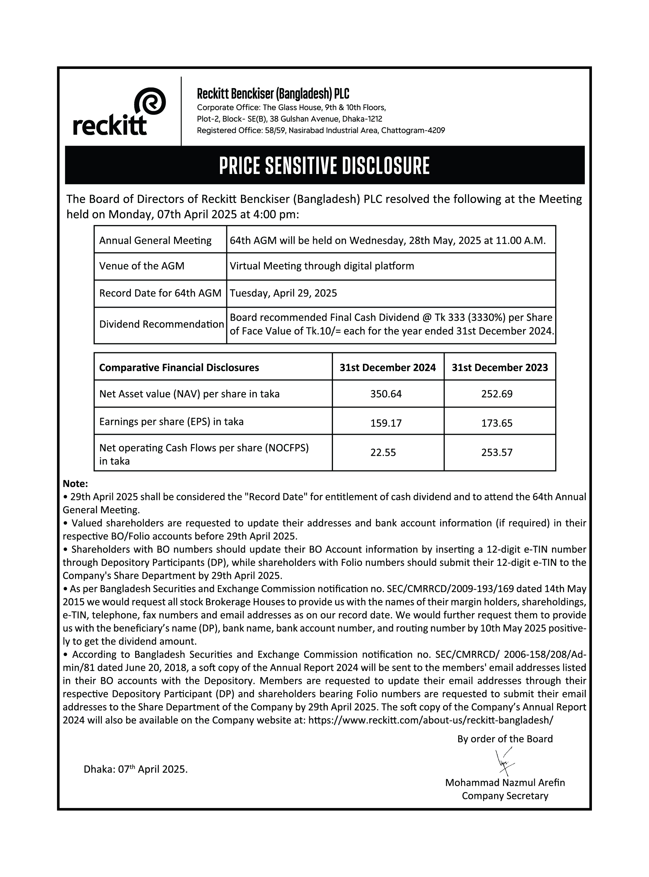 Reckitt's price sensitive disclosure 08 April, 2025, 12:15 pm Last modified: 08 April, 2025, 12:18 pm Download/Print Keep updated, follow The Business Standard's Google news channel Reckitt