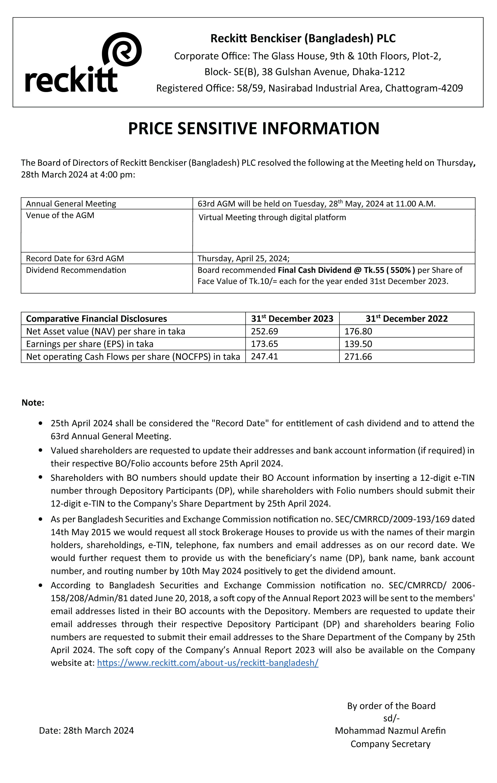 Reckitt's price sensitive information 28 March, 2024, 05:05 pm Last modified: 28 March, 2024, 05:19 pm Download/Print Keep updated, follow The Business Standard's Google news channel Reckitt Benckiser Bangladesh