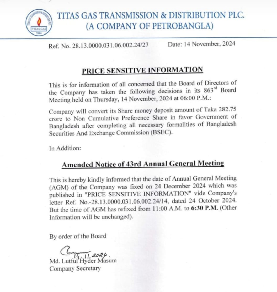 Titas gas price sensitive information 15 November, 2024, 12:40 pm Last modified: 15 November, 2024, 12:55 pm Download/Print Keep updated, follow The Business Standard's Google news channel Titas Gas / PSI