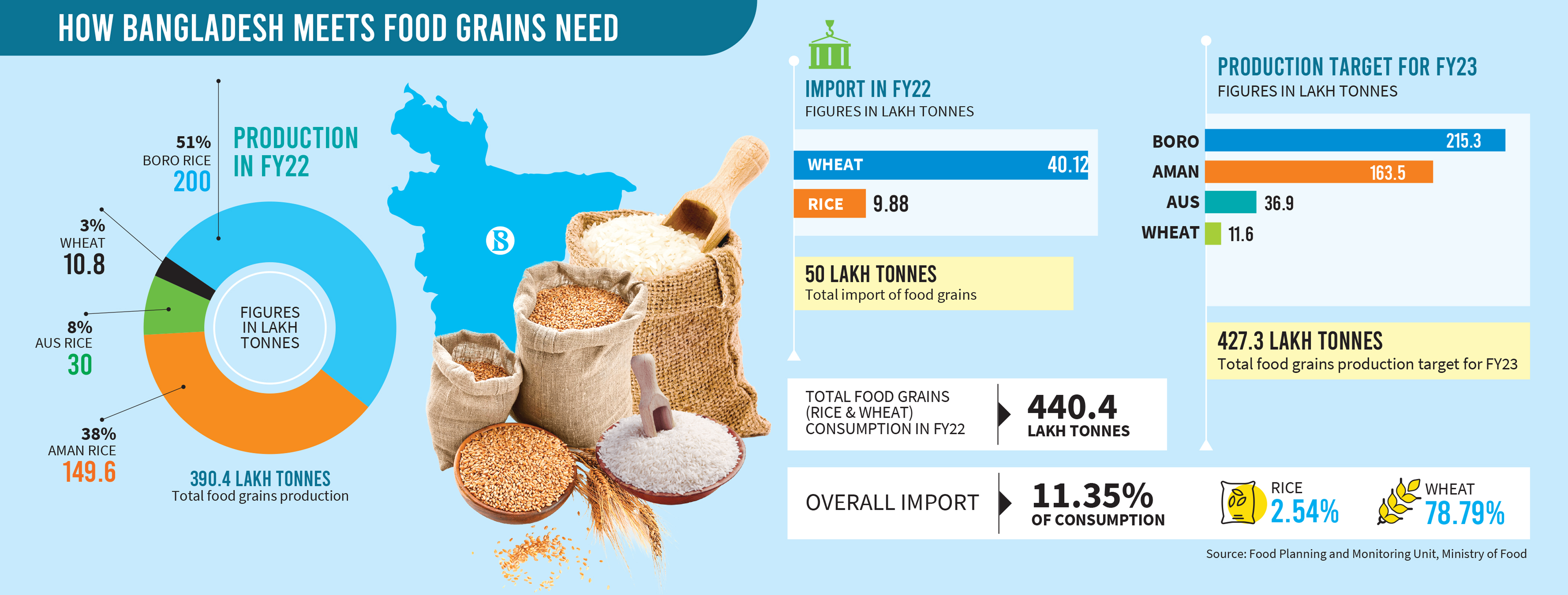 How Bangladesh meets food grain need Mohsin Bhuiyan 02 February, 2023, 12:55 pm Last modified: 02 February, 2023, 12:59 pm Download/Print Research: Moshin Bhuiyan Food Grain