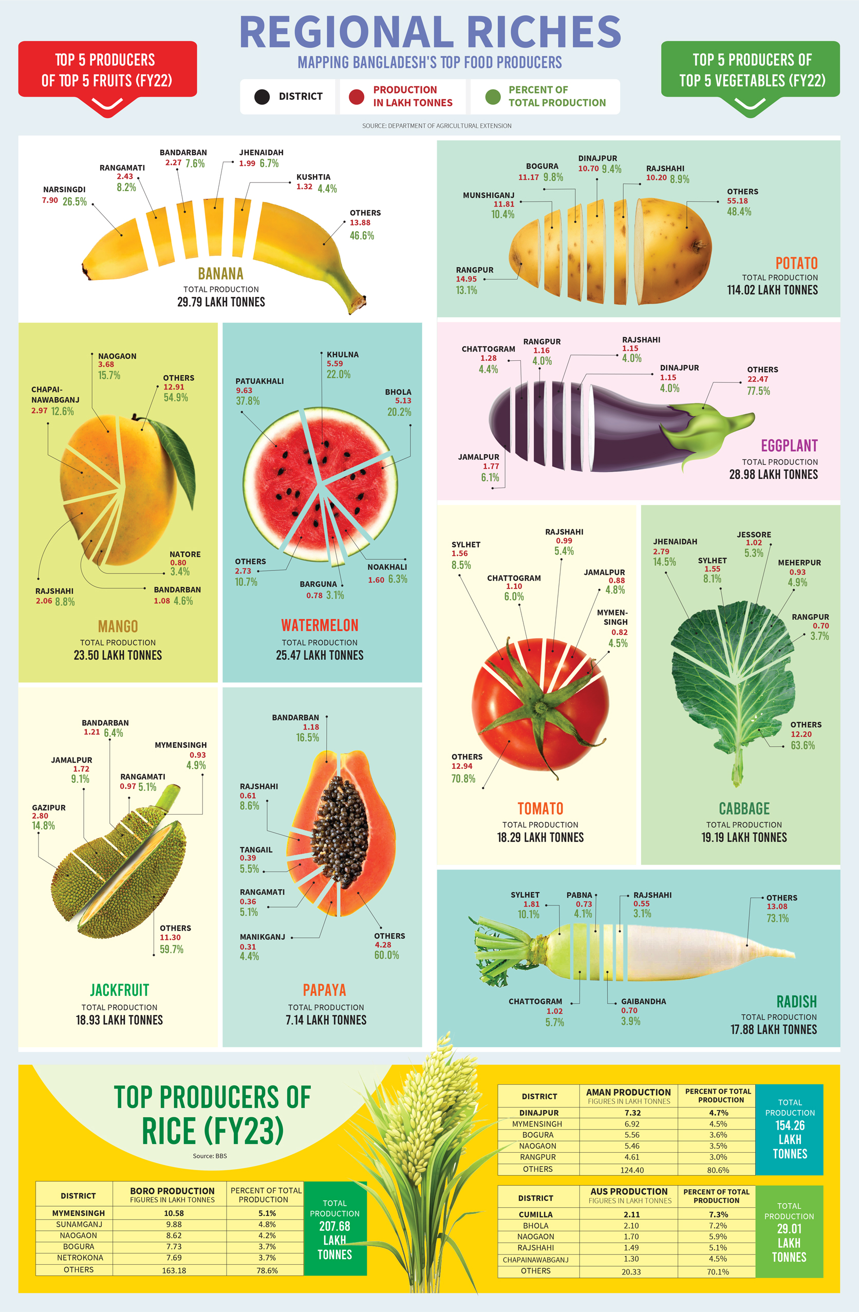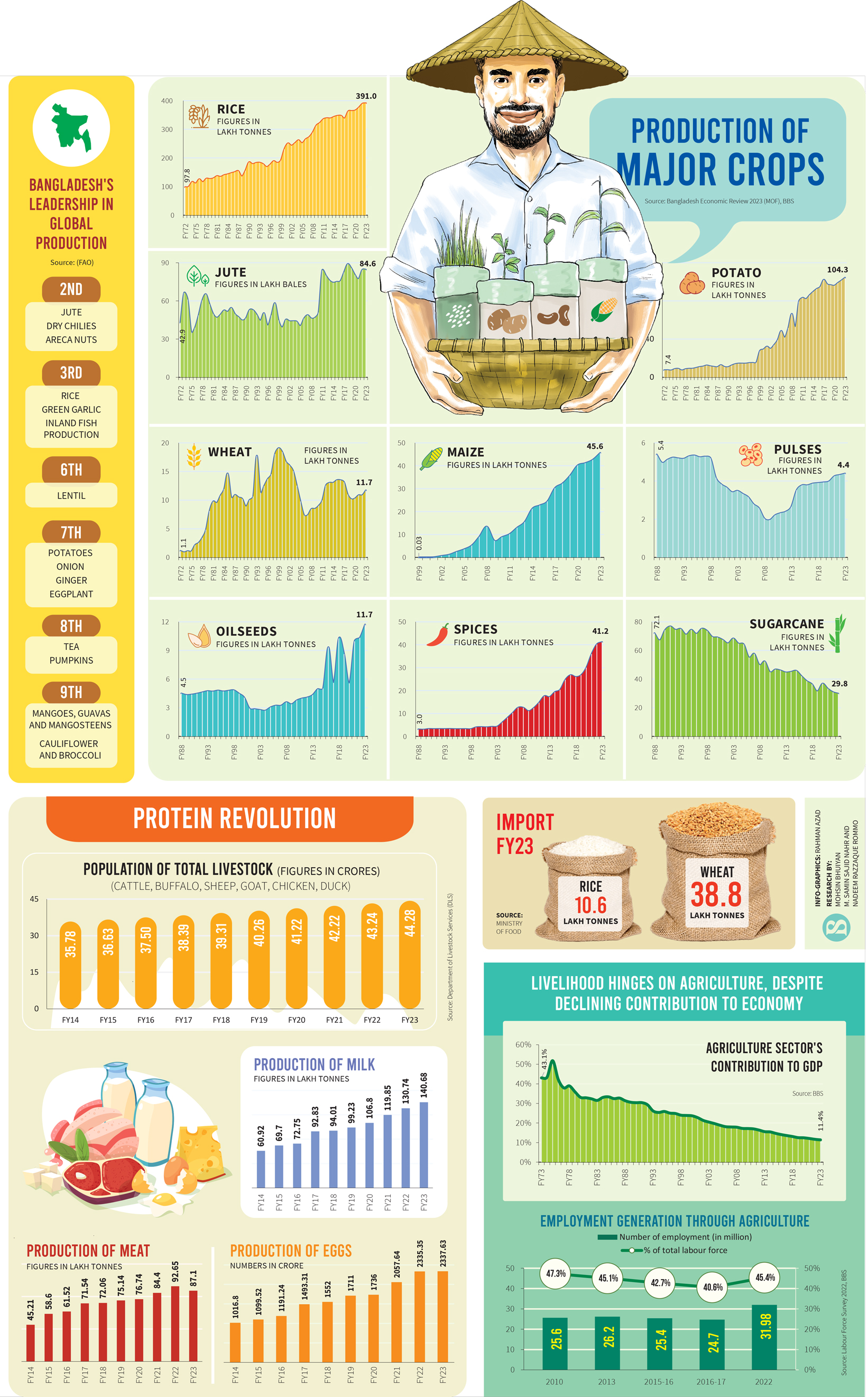 The story of Bangladesh's agriculture revolution Mohsin Bhuiyan, M Samin Sajid Nahr & Nadeem Razzaque Rommo 29 February, 2024, 12:10 pm Last modified: 29 February, 2024, 02:45 pm Download/Print Infograph: Rahman Azad Download/Print Infograph: Rahman Azad Keep updated, follow The Business Standard's Google news channel Agriculture agricultural goods / Bountiful Basket